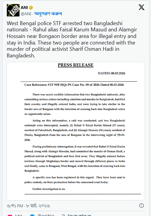এএনআইয়ের প্রতিবেদনে বলা হয়েছে, অবৈধভাবে অনুপ্রবেশ ও অবস্থানের অভিযোগে রাহুল ওরফে ফয়সাল করিম মাসুদ এবং আলমগীর হোসেন নামে দুই বাংলাদেশি নাগরিককে ভারতের বনগাঁও সীমান্ত এলাকা থেকে গ্রেপ্তার করা হয়েছে। পশ্চিমবঙ্গ পুলিশের স্পেশাল টাস্ক ফোর্সের (এসটিএফ) সদস্যরা রোববার তাদের গ্রেপ্তার করেছেন। গ্রেপ্তারকৃতরা বাংলাদেশে রাজনৈতিক কর্মী শরিফ ওসমান হাদি হত্যাকাণ্ডের সঙ্গে জড়িত বলে জানা গেছে।