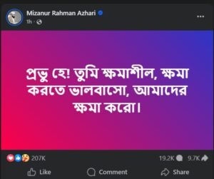 ওই পোস্টে মিজানুর রহমান আজহারী লিখেছেন, ‘প্রভু হে! তুমি ক্ষমাশীল, ক্ষমা করতে ভালোবাসো, আমাদের ক্ষমা করো।’