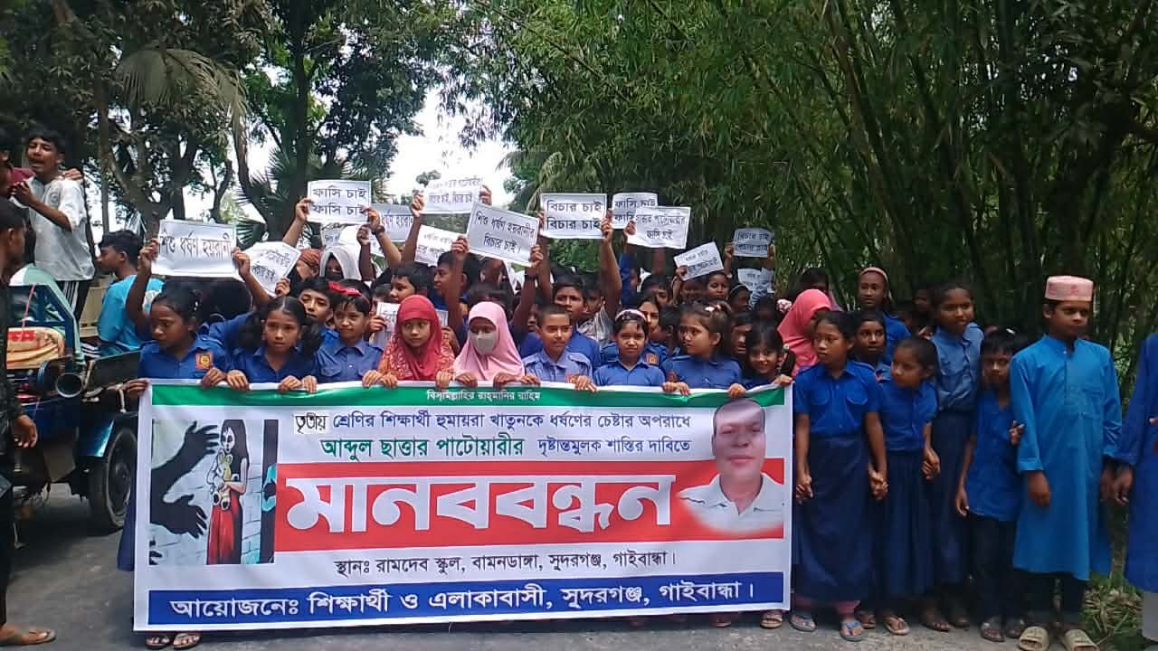 গাইবান্ধার সুন্দরগঞ্জ উপজেলায় তৃতীয় শ্রেণির এক শিক্ষার্থীকে ধর্ষণের চেষ্টার অভিযোগে আব্দুল ছাত্তার পাটোয়ারীর দৃষ্টান্তমূলক শাস্তির দাবিতে মানববন্ধন অনুষ্ঠিত হয়েছে।